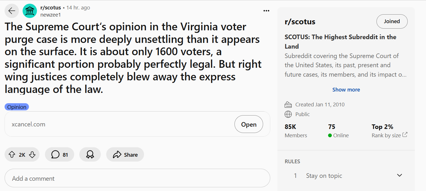 2. Congress has superseding authority on federal elections. Actions like Youngkin took are expressly forbidden within the 90 day window before the election. Six justices decided that their partisan views are more significant than the law. This is not the first time.3. Alito has led the way here. He has made it clear, with a majority of allies, that they will rewrite the law and impose their own views. It is an astonishing and deeply disturbing distortion of what the framers intended, and how the Court operated before Roberts took over.4. This is a Court engaged in a hostile takeover of the Constitution and democracy. Justices, including the Chief, arrogant enough to believe that the ethic standards that apply to everybody else in government don’t matter for them.5. Even if Trump loses, the Roberts court will do everything it can to undermine the Harris presidency and promote voting rules that enable Jim Crow-style actions in the states and undermine voting rights while giving enormously way to the rich and powerful who share its politics.
